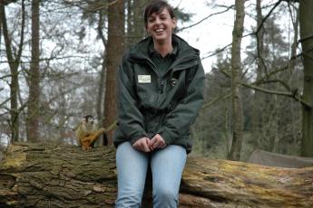 Apen fascineren haar, zegt ze. Niet verwonderlijk als je graag een stage bij Apenheul wilt lopen. Maar waarom eigenlijk? „Ik was op de middelbare school al geďnteresseerd in apen. Ik dacht: Daar wil ik later mee doorgaan. Ze lijken zo veel op mensen. Dat vind ik interessant.” Pas twee weken werkt ze nu in Apenheul. Veel bijzondere dingen heeft ze daarom nog niet gedaan of meegemaakt. Het is vooral een kwestie van meelopen met de andere dierverzorgers. „Ik mag nu net een klein deel van de apen voeren. Daarvoor kreeg ik allemaal uitleg over wat je aan apen mag voeren en of ze wel of niet bij de bezoekers mogen zitten.” Dat laatste mag niet, weet ze nu. „Ze mogen ook niet aan ons, verzorgers, zitten. Anders is het verwarrend voor ze.”