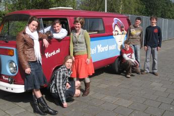 Op het schoolplein is het even later dringen bij de Yordbus. Honderden leerlingen proberen een flesje water of een ’stoeltje’ -handig voor je mobiele telefoon- te bemachtigen.