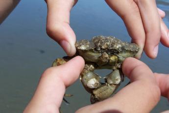 De tocht gaat verder door enkeldiep water. Grote witte en roze krabben schieten weg als voeten dichterbij komen. Anita griezelt, Marleen kijkt gefascineerd toe. „Ik wil er een pakken”, zegt ze. Dat blijkt moeilijk te gaan. Hun scharen klappen angstwekkend snel dicht als er een vinger in de buurt komt. Marleen roept de hulp van een gids in. „Je moet eerst op hun schild drukken en dan met je vingers hun scharen vastzetten. De gids pakt een krab vast en doet het voor. Marleen neemt het beest van hem over. „Ik hoef niet ’m niet, Leen”, zegt Anita als Marleen het spartelende beest wil doorgeven. Met een plons zet ze de krab dan maar terug in het water, waar kleine garnalen zich snel uit de voeten maken. De groene dijk van Schiermonnikoog komt snel dichterbij. Dat werd tijd. „Morgen zit ik met spierpijn achter de kassa”, kreunt Anita. „Maar de tocht was superleuk”, zijn de meiden het met elkaar eens. „Dat gaan we nog ’s doen, Aniet”, zegt Marleen, klaar voor een volgende uitdaging. „’s Nachts of zo?”