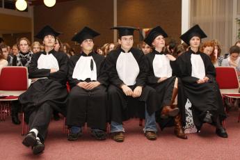 Inmiddels studeren ze alle vijf. Arco den Heijer (18), een van de gelukkigen, moet lachen als hij zich woensdagavond weer voor de geest haalt. „Toen we binnenkwamen werden we meteen meegeloodst naar een kamer waar vijf toga’s lagen. Dat was wel een verrassing, ja.”