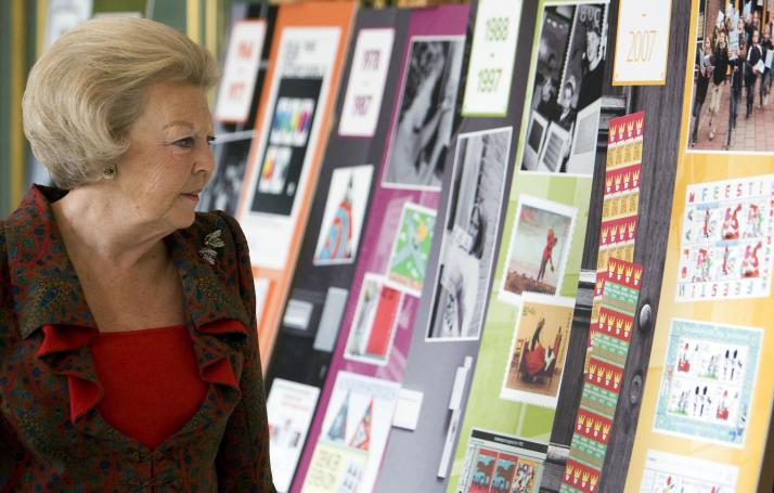 DEN HAAG - Koningin Beatrix kijkt op paleis Huis ten Bosch naar afbeeldingen van de nieuwe kinderpostzegels en kaarten. - Foto ANP