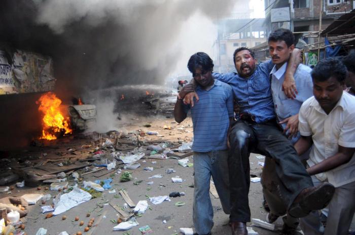INDIA - Inwoners van Guwahati dragen een gewonde. - Foto EPA