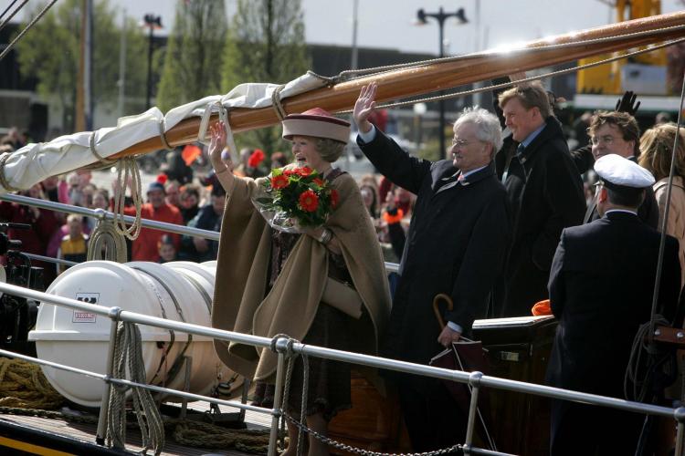 Koninklijke familie verlaat Zeewolde. V.l.n.r.: koningin Beatrix, haar kamerheer, prins Willem-Alexander, prins Friso en zijn vrouw prinses Mabel.