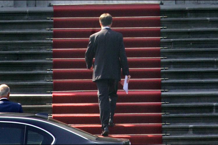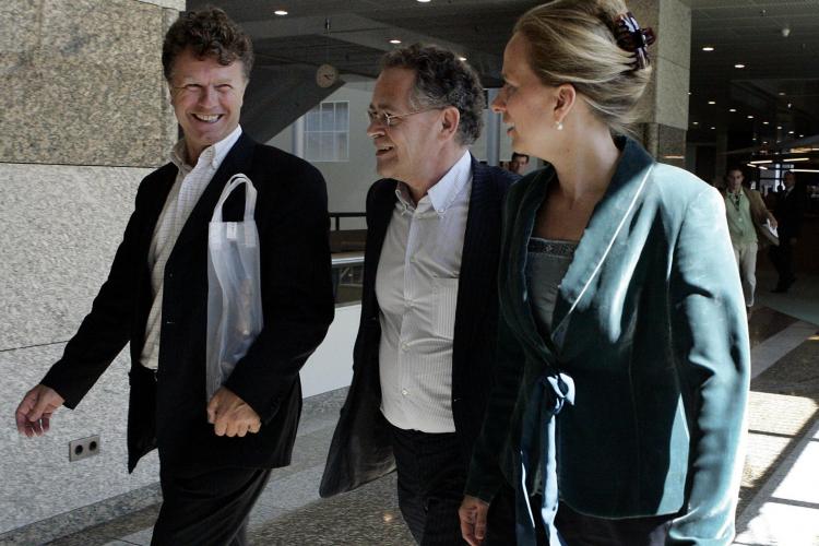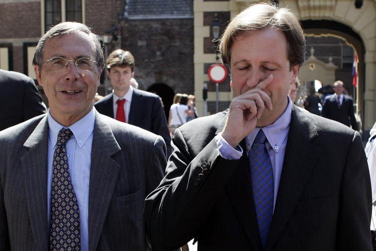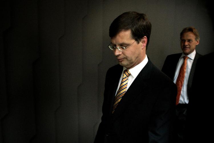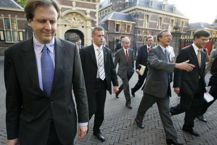 DEN HAAG - Minister Pechtold loopt na beraad in het torentje met premier Balkenende en minister Brinkhorst naar de plenaire zaal om ontslag in te dienen.