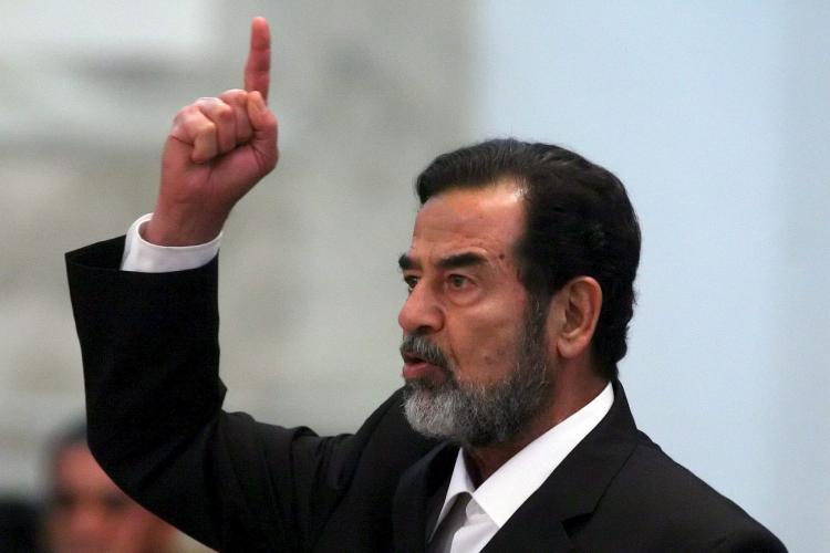 Saddam protesteert als hij de uitslag van het vonnis hoort. Hij is veroordeeld tot de doodstraf. Na de bekendmaking van de straf riep hij: „Lang leve de roemrijke natie. Dood aan zijn vijanden!” - Foto's EPA