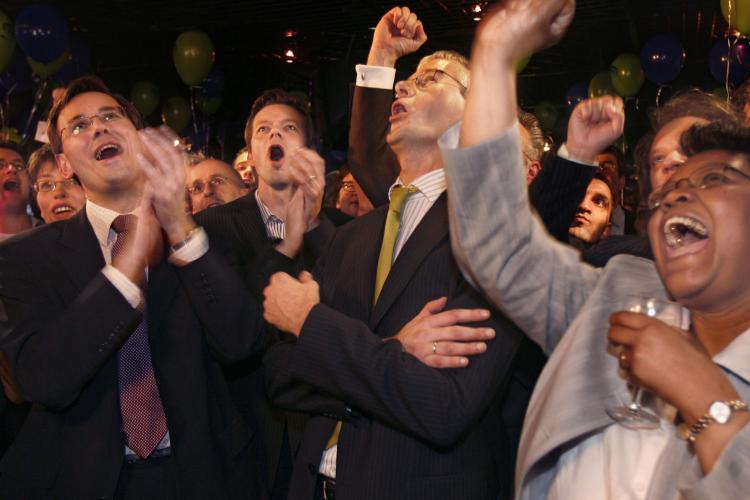 De ChristenUnie komt in beeld. Deze partij met zes zetels kan CDA en PvdA aan een meerderheid in de Tweede Kamer helpen. CDA en PvdA hebben samen 74 zetels en de CU heeft er zes. Foto: Blije gezichten bij de CU als blijkt dat de partij bij de Tweede Kamerverkiezingen fors heeft gewonnen.