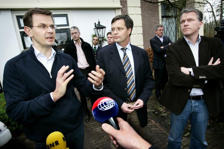 De uitkomsten van de gesprekken worden vastgelegd in een document. Dat gebruiken de partijen voor verder overleg. In het stuk geven CDA, PvdA en CU aan welke richting ze met het nieuwe kabinet op willen. Foto: CU-leider Rouvoet staat de pers te woord.