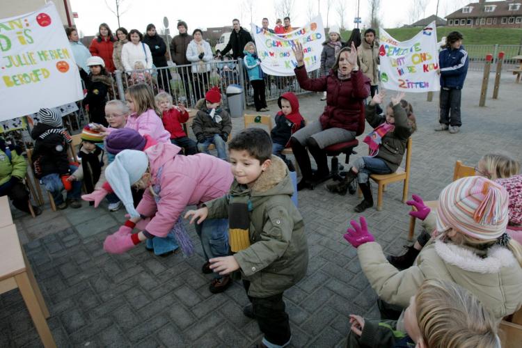 MAANDAG - Kleuters van basisschool De Schakel in Lelystad krijgen buiten les uit protest tegen het gemeentebeleid. De school kampt met ruimtegebrek. Onderhandelingen met de gemeente duren al twee jaar; een oplossing is nog niet gevonden. - Foto's ANP/RD/EPA