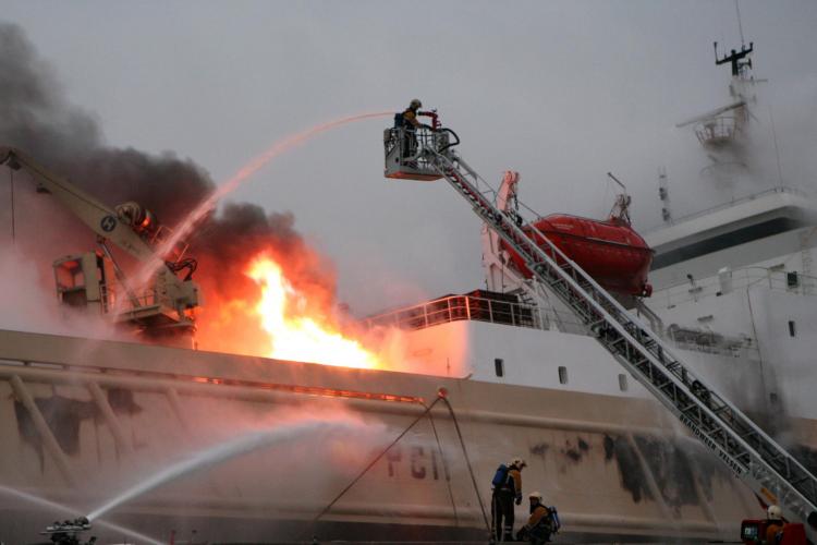 DINSDAG - Dikke rookwolken hangen boven de haven van Velsen Noord. Omdat er bij de brand op het grote visserschip gevaarlijke stoffen vrij kwamen, werden bedrijventerreinen en een aantal omliggende woningen ontruimd.