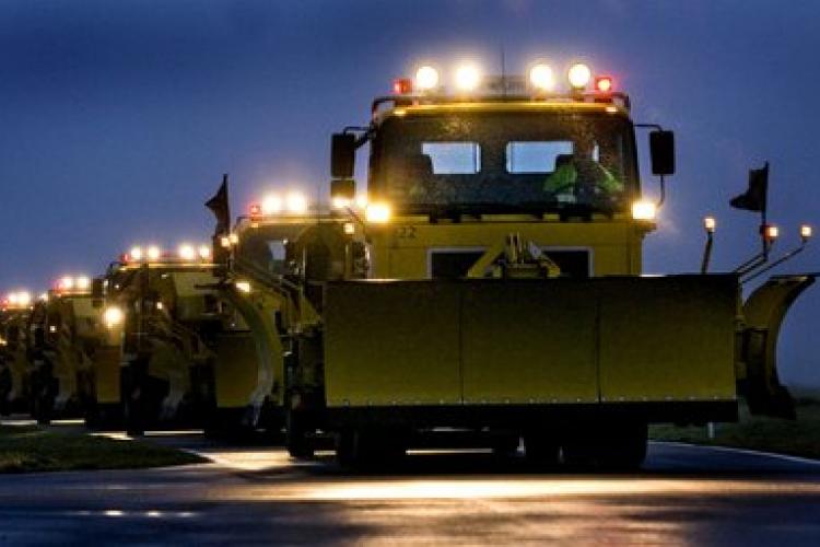 WOENSDAG - Ondanks het milde winterweer blijft de luchthaven Schiphol voorbereid op sneeuwval. Een lange karavaan sneeuwschuivers trekt het landingsterrein op voor een oefening.