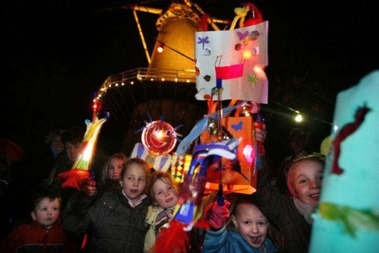 WOENSDAG - Kinderen vormen een lampionnenoptocht door het Oranjestadje Buren, ter gelegenheid van de verjaardag van koningin Beatrix. De vorstin werd 69 jaar.