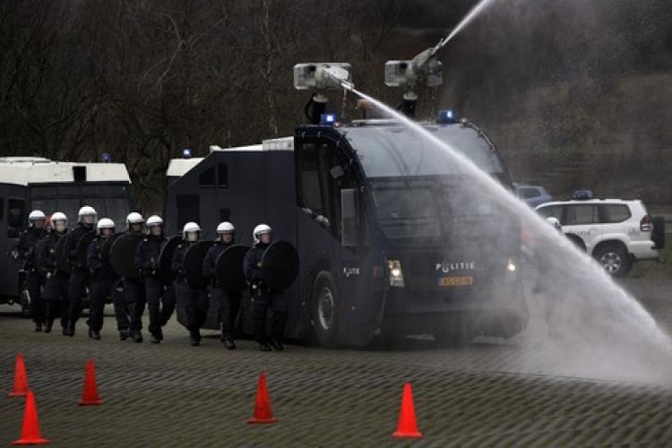 DONDERDAG - De politie Haaglanden demonstreert een nieuwe waterwerper. De politiekorpsen Haaglanden, Rotterdam Rijnmond en Amsterdam Amstelland kregen vorige maand ieder twee hypermoderne waterwerpers, bedoeld om bijvoorbeeld krakers of groepen hooligans uiteen te drijven.