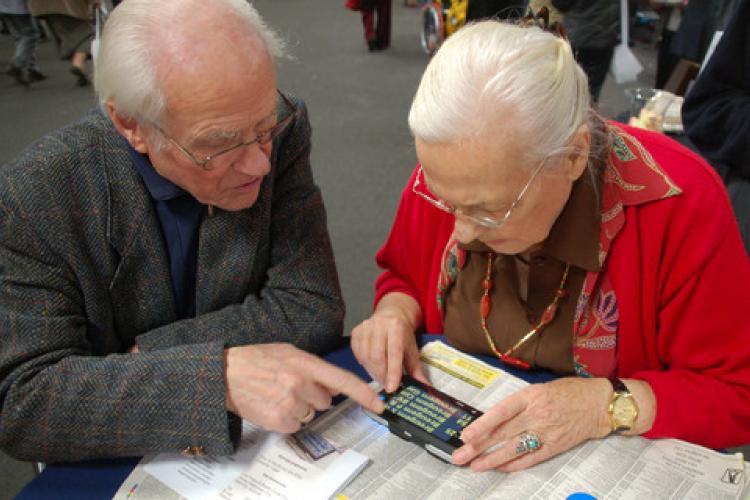 DONDERDAG - Een ouder echtpaar buigt zich op de blindenbeurs ZieZo over een apparaat dat tekst uit bijvoorbeeld een telefoonboek vergroot. Het aantal blinden en slechtzienden groeit tot 2020 naar verwachting met ruim 40 procent.