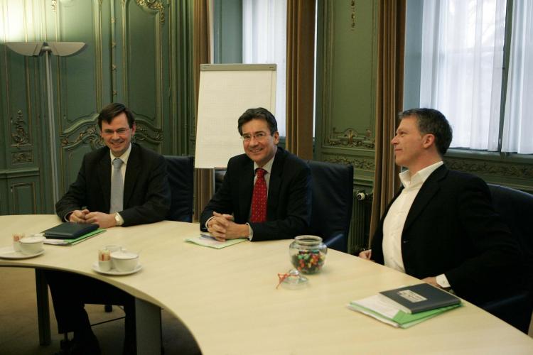 MAANDAG - Formateur Balkenende voert in het gebouw van de Eerste Kamer overleg met v.l.n.r. de fractievoorzitters Rouvoet (CU), Verhagen (CDA) en Bos (PvdA) over de verdeling van de ministersposten in het nieuwe kabinet. - Foto's RD, ANP, EPA