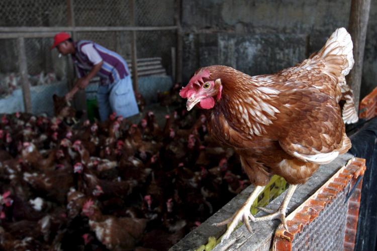 MAANDAG - Een Indonesische werknemer sorteert kippen op een boerderij in Jakarta. Een 20-jarige vrouw in West Java is overleden aan de gevolgen van vogelgriep. Ze is de 64e persoon die in Indonesië aan de gevaarlijke variant van de griep –H5N1– is bezweken.