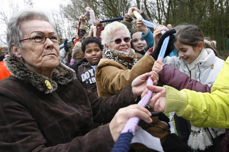 DINSDAG - Kinderen en oudere dames versieren het Semiramispark in Rotterdam met een 500 meter lange sjaal. Ze willen daarmee aandacht vragen voor een herinrichtingsplan om het park weer waardevol te maken voor de wijk. De sjaal is gebreid door 75 dames, die er de afgelopen maanden dagelijks druk mee waren.