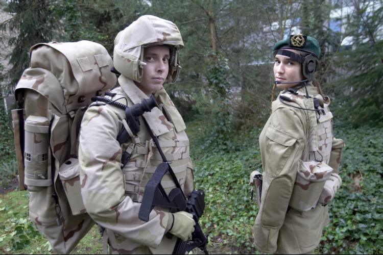WOENSDAG - Twee soldaten tonen het tenue dat militairen in de toekomst gaan dragen. Soldaten in gevechtsfunctie krijgen onder meer via een microdisplay te zien waar ze zich in het veld bevinden en waar hun tegenstander zich schuilhoudt.