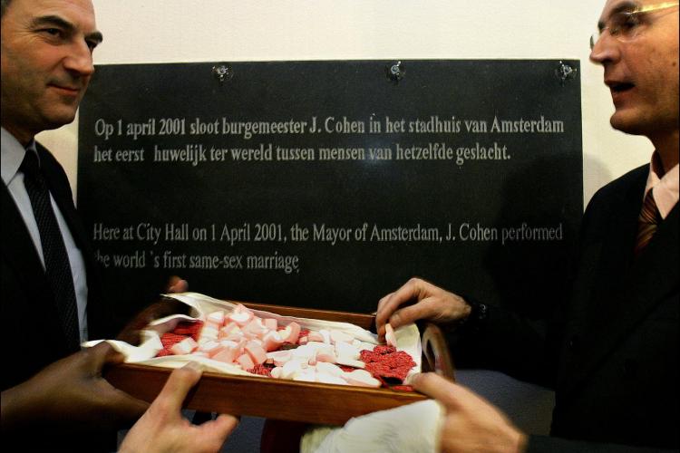 WOENSDAG - Burgemeester Cohen van Amsterdam (l.) heeft een herdenkingsplaquette van het homohuwelijk onthuld. Op 1 april 2001 sloot Cohen het eerste volledig gelijkberechtigde huwelijk ter wereld tussen mensen van hetzelfde geslacht.