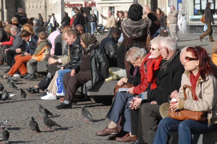 VRIJDAG - Op de banken voor het Paleis op de Dam in Amsterdam genieten dagjesmensen en toeristen van de zon.