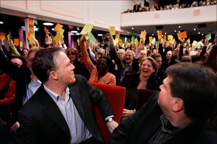 ZATERDAG - Het PvdA-congres heeft in Zwolle met grote meerderheid ingestemd met regeringsdeelname van de partij. Partijleider Bos en de nieuwe Tweede Kamerfractieleider Tichelaar (r.) kijken naar de stemming.