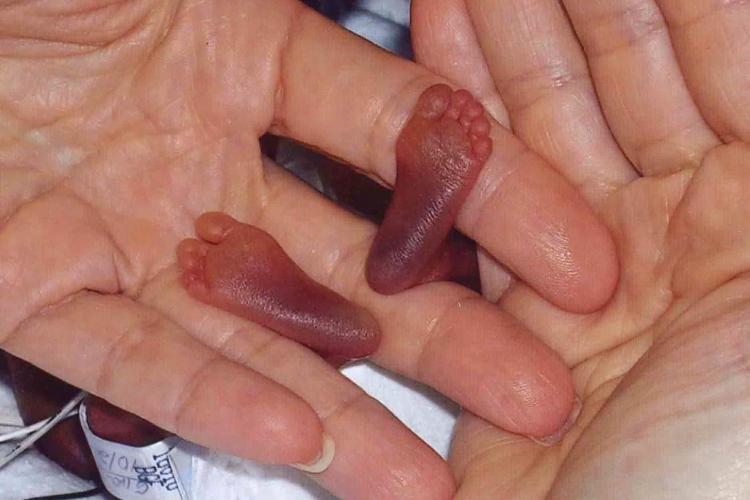 DINSDAG - De voetjes van Amillia Taylor, het meisje dat na een zwangerschap van 22 weken op 24 oktober werd geboren in een ziekenhuis in de Amerikaanse staat Florida. Ze woog toen 286 gram en was niet grote dan een balpen.