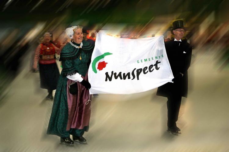 DINSDAG - Burgemeester D. H. A. van Hemmen van Nunspeet krijgt bij de ijsbaan van de gezinsbeurs Wegwijs zijn gemeentevlag uit handen van leden van de Landelijke Vereniging van Schoonrijders.