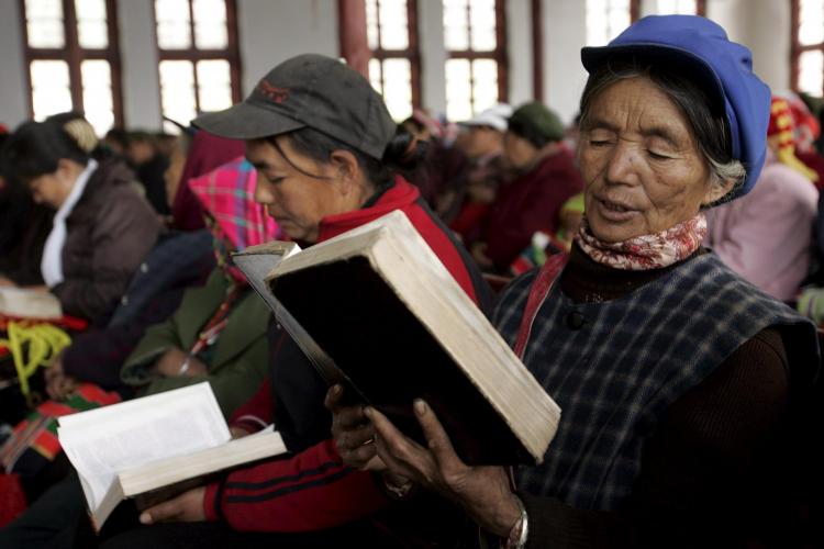 DINSDAG - Vrouwen in het dorpje Lao Mudeng lezen uit de Bijbel tijdens een kerkdienst ter gelegenheid van het net begonnen Chinese Nieuwjaar. Het christendom in China blijkt veel meer aanhangers te hebben dan werd gedacht. Stichting Open Doors gaat uit van 60 tot 80 miljoen christenen.