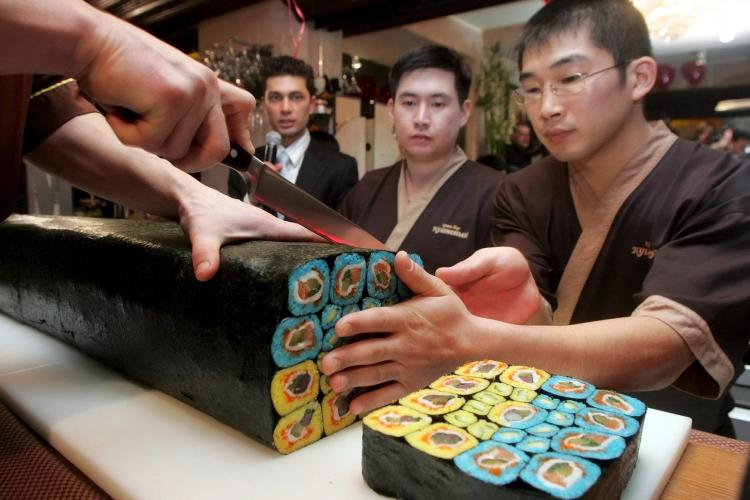 WOENSDAG - Een chef kok in een restaurant in Kiev (Oekraïne) snijdt een plak van een gigantische sushirol, ‘geschilderd’ in de kleuren van de vlag van Oekraïne. De rol is 93 centimeter lang, heeft een doorsnee van 19 centimeter en weegt 24,5 kilo. De lekkernij krijgt een plaatsje in het Oekraïense ”Book of Records”.
