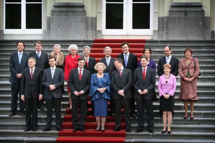 DONDERDAG - Het vierde kabinet onder leiding van premier Balkenende is beëdigd op Paleis Huis ten Bosch. Daarna betraden de nieuwe bewindslieden de trappen van het paleis voor de traditionele bordesfoto. Het was voor koningin Beatrix de tiende keer dat ze met een ministersploeg op het bordes stond. Op de voorste rij v.l.n.r.: Hirsch Ballin (Justitie), Rouvoet (Jeugd en Gezin, vicepremier), Balkenende (Algemene Zaken, premier), koningin Beatrix, Bos (Financiën, vicepremier), Verhagen (Buitenlandse Zaken) en Ter Horst (Binnenlandse Zaken). Daarachter v.l.n.r.: Koenders (Ontwikkelingssamenwerking), Donner (Sociale Zaken), Van der Hoeven (Economische Zaken), Cramer (VROM), Plasterk (Onderwijs, Cultuur en Wetenschap), Van Middelkoop (Defensie), Eurlings (Verkeer en Waterstaat), Verburg (Landbouw, Natuur en Voedselkwaliteit), Klink (Volksgezondheid, Welzijn en Sport) en Vogelaar (Wonen, Wijken en Integratie).