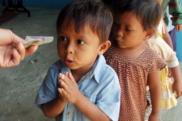 MAANDAG – Cambodjaanse weeskinderen krijgen zakgeld van hun leraar. De ouders van de kinderen zijn overleden aan hiv/aids. Cambodja is een van de armste landen ter wereld en heeft verhoudingsgewijs veel aidsslachtoffers.