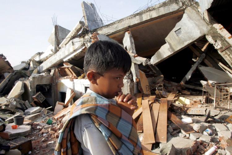 WOENSDAG – Een jongetje staat bij een ingestorte woning in Solok, West Sumatra. Een aardbeving op het Indonesische eiland Sumatra heeft een enorme schade aangericht. Er zijn zeker 74 mensen om het leven gekomen.