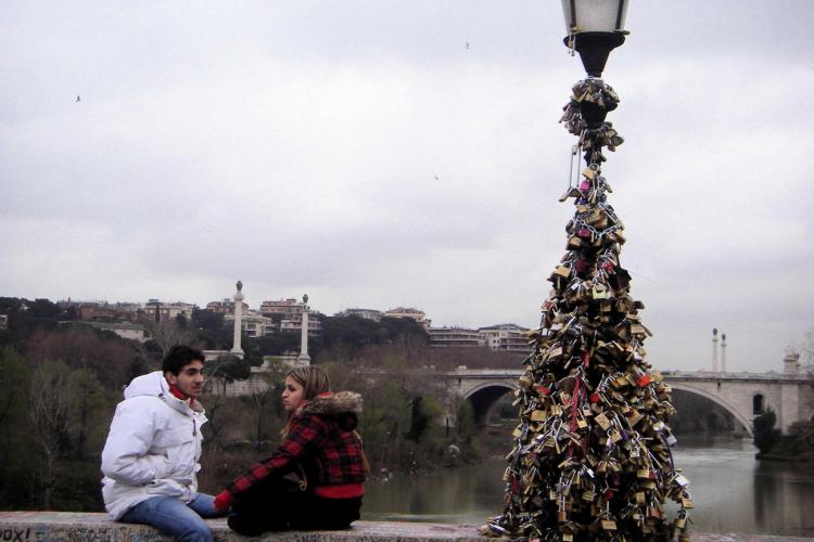 DONDERDAG – Een paar honderd sloten sieren de lantaarnpaal op Ponte te Milvio. Een antieke brug in Rome is het mekka van jonge stelletjes. Het samen sluiten van een slot geldt als symbool voor de liefde.
