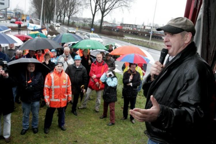 VRIJDAG - SP-voorman Marijnissen spreekt stakers van het sleepbedrijf Smit toe. Het is al de vierde dag dat werknemers van het Rotterdamse bedrijf protesteren tegen de cao.