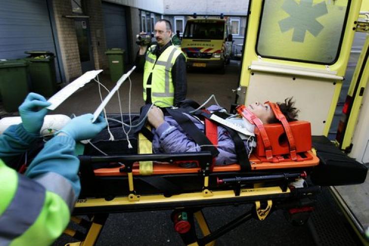 ZATERDAG – Het Máxima Medisch Centrum in Veldhoven houdt een grote rampenoefening. Een ambulance rijdt een slachtoffer naar de Eerste Hulp.
