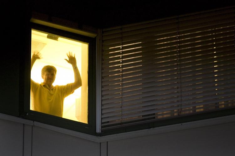 Prins Willem-Alexander zwaait uit het raam van het ziekenhuis.