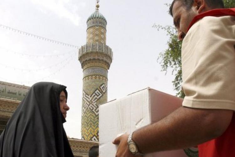 MAANDAG - Een medewerker van het Rode Kruis deelt voedselpakketten uit aan Iraakse burgers in het centrum van Bagdad.