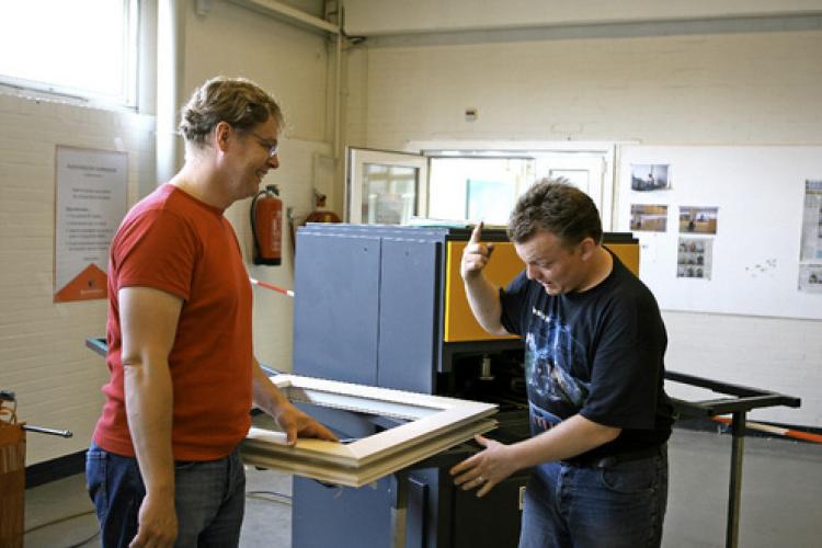 VRIJDAG - Communiceren met gebaren is de gewoonste zaak van de wereld in de Groningse fabriek De Verbinding. Negen dove werknemers en een horende chef gaan hier vanaf 4 juni dakkapellen, kunststof kozijnen en schuifpuien produceren. Kozijnenfabriek Schipper uit het Noord Hollandse Opmeer staat garant voor de afname.