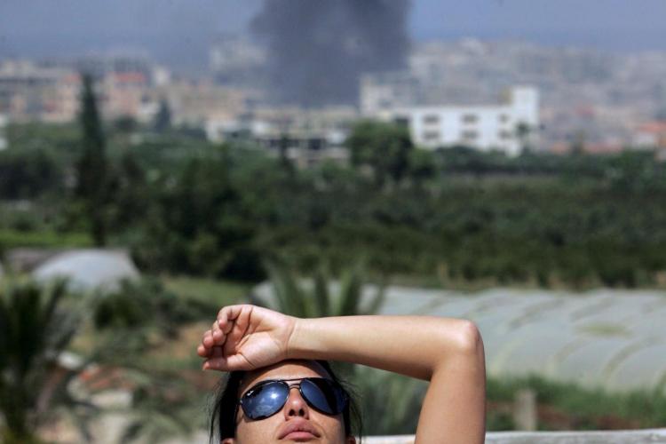 MAANDAG - Een Libanese vrouw geniet ongestoord van de zomerzon terwijl achter haar de rookpluimen opstijgen vanuit het Palestijnse vluchtelingenkamp Nahr al Bared. De gevechten in het kamp tussen het Libanese leger en islamitische radicalen gingen afgelopen weekend onverminderd door. Bovendien kwam het ook in een tweede vluchtelingenkamp tot gewelddadigheden. - Foto's ANP/EPA/RD