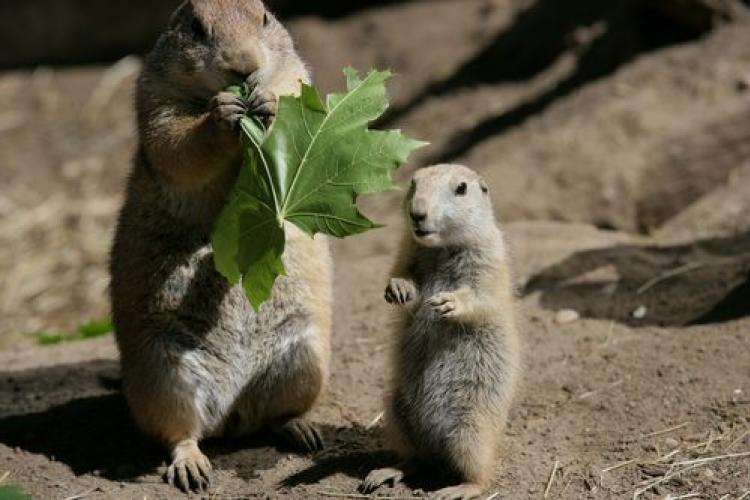 DINSDAG - In Ouwehands Dierenpark Rhenen genieten moeder en haar pasgeboren zwartstaartprairiehondje van een boomblad. Het dierenpark heeft te maken met een geboortegolf. Behalve elf prairiehondjes zijn er negen wilde ooievaars, een giraffe, wrattenzwijntjes, stokstaartjes en berberapen geboren.