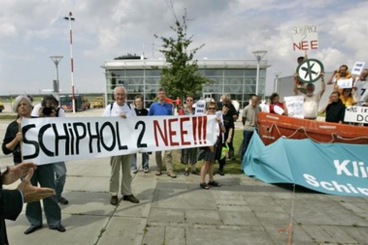 DINSDAG - Voor de ingang van vliegveld Lelystad staan actievoerders van Milieudefensie en bewoners van Lelystad in een sloep. Zij protesteren tegen de uitbreidingsplannen van vliegveld Lelystad.