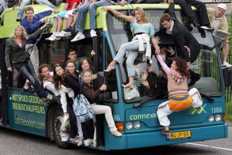 WOENSDAG - Een overvolle bus met passagiers op het dak en aan de zijkant rijdt rondjes op het busstation van Hoofddorp. Vervoersbedrijf Connexxion probeert zo 300 nieuwe buschauffeurs te werven. De 200 bussen die nodig zijn, staan er al; de chauffeurs die er op moeten rijden zijn er nog niet.