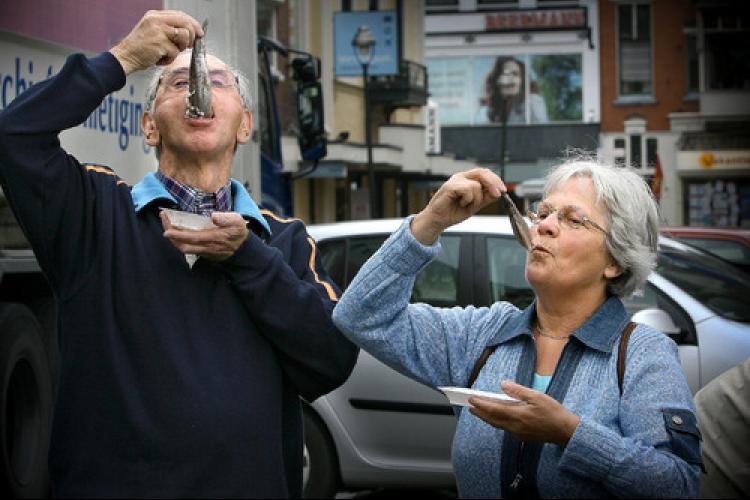 WOENSDAG – Een echtpaar geniet in Apeldoorn van de eerste Hollandse nieuwe. Het symbolische eerste vaatje Hollandse nieuwe bracht 70.000 euro op. Dat bedrag gaat naar het Wereld Kanker Onderzoek Fonds.