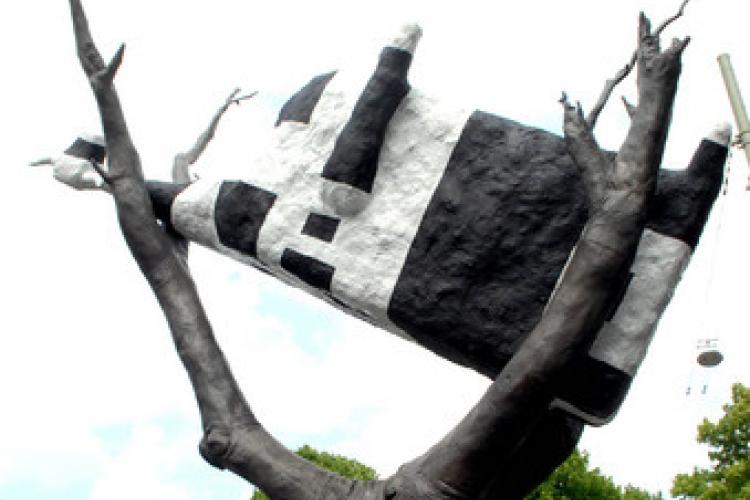 WOENSDAG - Een koe in de boom. Het is bedoeld als kunstwerk en staat bij het Lange Voorhout in Den Haag als onderdeel van de jaarlijkse openluchtexpositie die tot 10 september te zien is. Dit jaar staat Australische en Nederlandse kunst centraal.