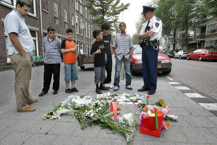 VRIJDAG – Een groep jongeren en een politieagent staan stil bij de plaats waar donderdagavond een 18 jarige man door een steekpartij om het leven is gekomen. De dader is spoorloos. Het slachtoffer sprak hem aan op een fietsendiefstal, waarop hij werd doodgestoken.