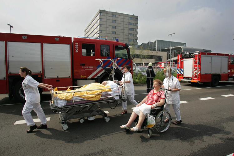MAANDAG - Hulpverleners brengen patiënten van het Lukasziekenhuis in Apeldoorn in veiligheid. Vier etages werden ontruimd nadat er in een liftschacht op de derde verdieping brand ontstond. Enkele personeelsleden moesten naar het ziekenhuis, verder vielen er geen ernstig gewonden. - Foto's ANP, EPA, RD