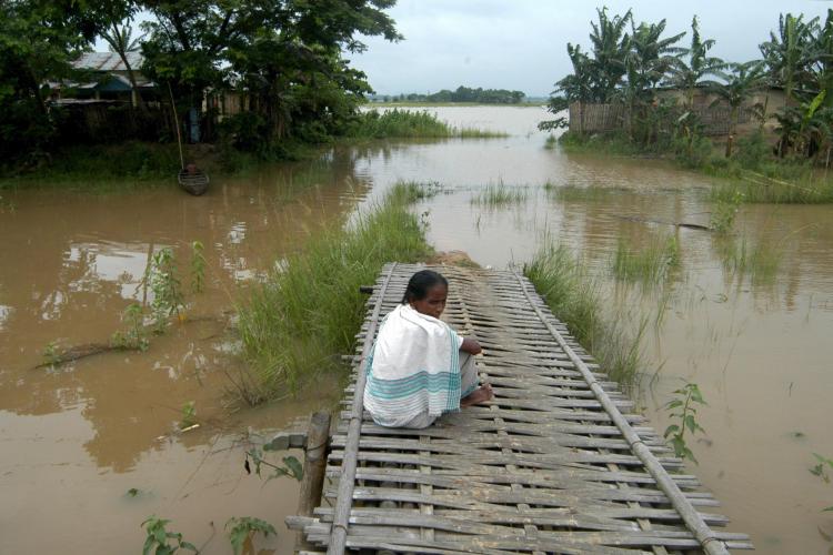 MAANDAG - Een oude vrouw uit Satpulholi, een dorpje in het noordoosten van India, wacht terwijl ze op een omgevallen hek zit tot het water gaat zakken. Hevige regens hebben voor zware overstromingen geleid.