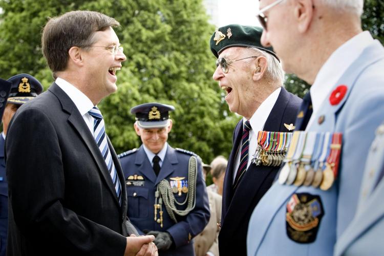 MAANDAG - Premier Balkenende en veteraan Charly Forbes lachen om een grapje. De minister-president ontmoette de veteraan na de kranslegging bij het nationale oorlogsmonument in Ottawa, tijdens een tweedaags bezoek aan Canada. De Canadese veteraan heeft in de Tweede Wereldoorlog in Zeeland gevochten.