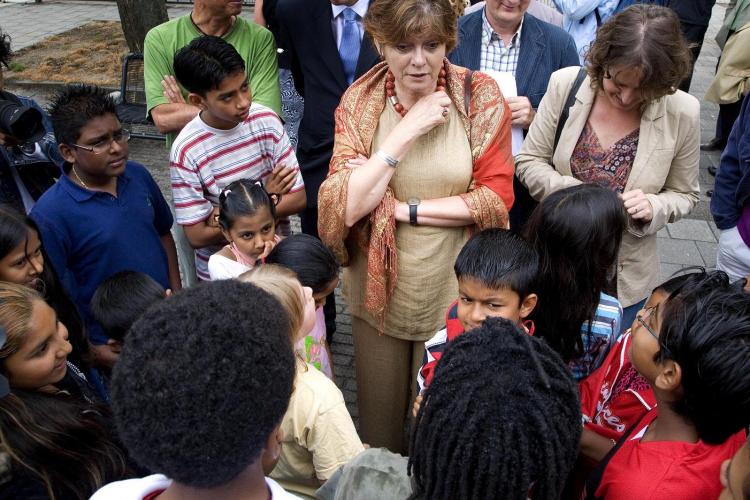 MAANDAG - Minister Vogelaar praat met kinderen in de Utrechtse wijk Ondiep. In de wijk ontstond onrust, nadat een agent die zich in het nauw gebracht voelde een 54 jarige inwoner van de wijk doodschoot. De minister is verantwoordelijk voor de aanpak van achterstandsgebieden.