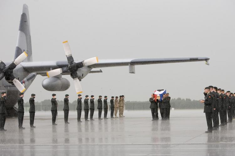 MAANDAG - Acht militairen dragen op de vliegbasis in Eindhoven de kist met het lichaam van de vrijdag in Afghanistan gesneuvelde militair Timo Smeehuijzen. Na een korte ceremonie werd het lichaam overgedragen aan de nabestaanden. Op de kist, die bedekt is met de Nederlandse vlag, liggen de baret van de soldaat, zijn medailles en een krans. - Foto's ANP/RD/EPA