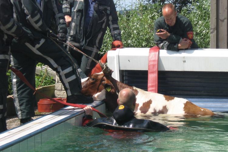 DINSDAG - Zeven brandweermannen proberen een twee jarige koe van 350 kilo uit een zwembadje te krijgen. Volgens de eigenaar werd het nieuwsgierige dier aangetrokken door het zwarte rolgordijn over het zwembad. Ondanks een glimlach maakt de veehouder zich wel zorgen. Ze is al vijf maanden zwanger. Wat dit voor haar gezondheid betekent is mij nog een raadsel”.